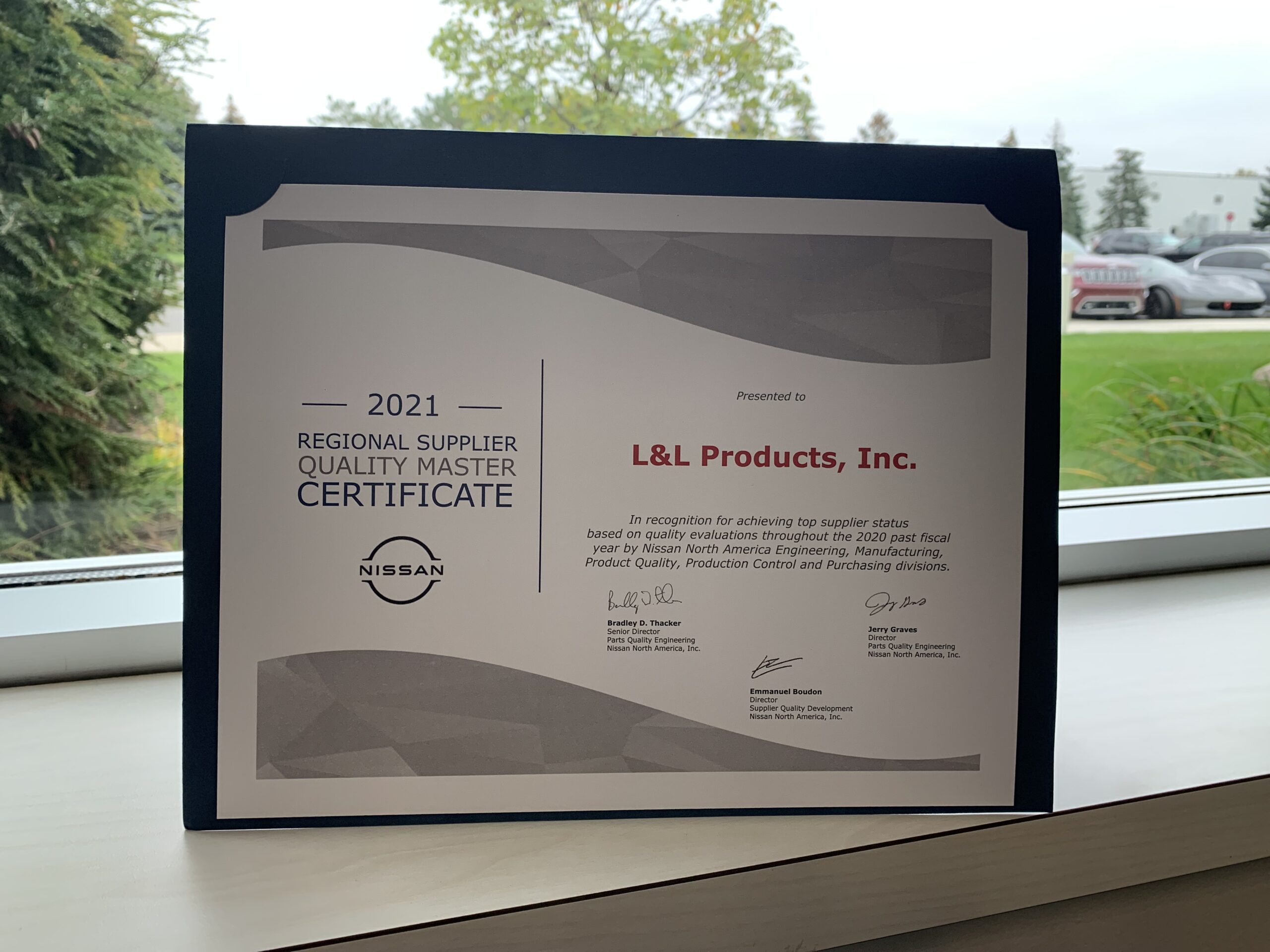 Nissan Kuzey Amerika, L&L Ürünleri'ne üst üste ikinci kez Bölgesel Tedarikçi Kalite Ana Ödülü verdi. L&L Products ekibi üyeleri ödülü Nashville, Tennessee'deki Country Music Hall of Fame'de düzenlenen törenle aldı. Nissan Kuzey Amerika'nın merkezi Franklin, Tennessee'dedir; Nashville'in yaklaşık 32 km dışında.