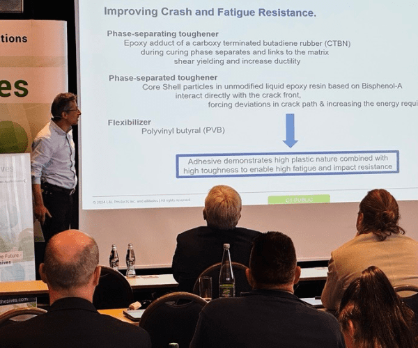 Sempozyum sırasında, L&L Products’ta Araştırma ve Geliştirme Mühendisi olarak görev yapan Michel Awkal, hafif kompozit motorlu araçlar için özel olarak tasarlanmış, yorgunluk ve darbeye dayanıklı bir yapısal yapıştırıcı üzerine çığır açıcı çalışmalarını sundu.